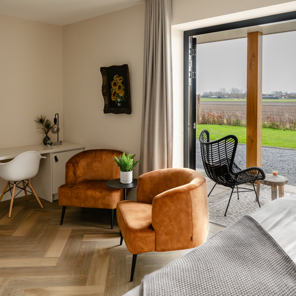 Met slechts vier gastenkamers ben je hier verzekerd van persoonlijke aandacht. Het zijn overigens niet zomaar gastenkamers bij De Cley. De kamers met de namen Haas, Schuit, Sjaak en Mr. de Mol (vernoemd naar mensen die geholpen hebben met de bouw van de bed and breakfast) zijn eigenlijk meer royale suites. Ze blinken uit in sfeer, oog voor detail, ruimte en comfort. Zo heeft elke kamer een eigen zitje, hebben de kamers op de begane grond een terras en geniet je in de kamers boven van een vrijstaand bad.