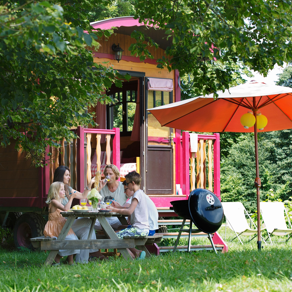 In het hoofdgebouw vind je de 2-persoons en familiekamers. De bijgebouwen en de stallen bieden nu plaats aan sfeervolle vakantiewoningen, met plek voor 4, 6 en 10 personen. Daarnaast staan er op het domein drie woonwagens, in een halve cirkel opgesteld. Elke ‘pipowagen’ biedt plaats aan 4 personen + 1 kind, er is een keuken en eigen badkamer. Voor gezamenlijk gebruik is er een barbecue vuurplaats bij de pipowagens.