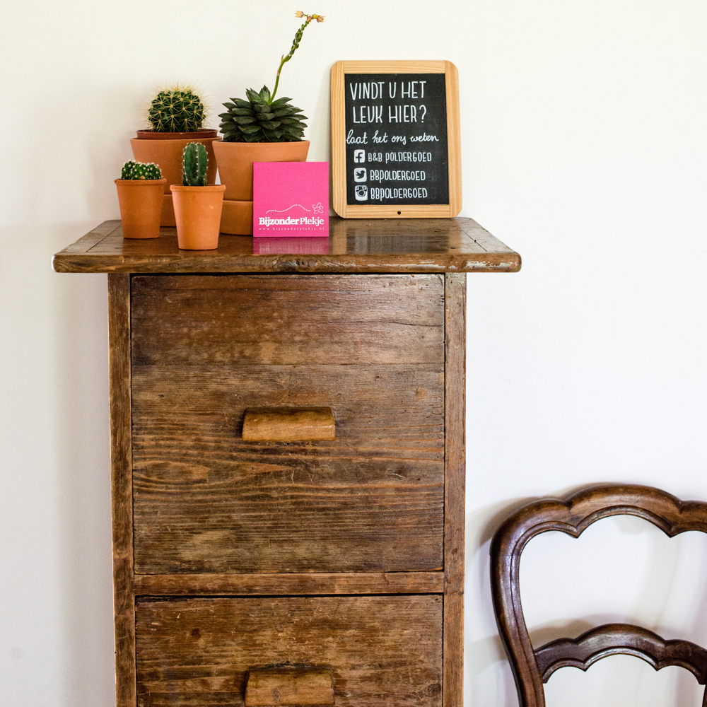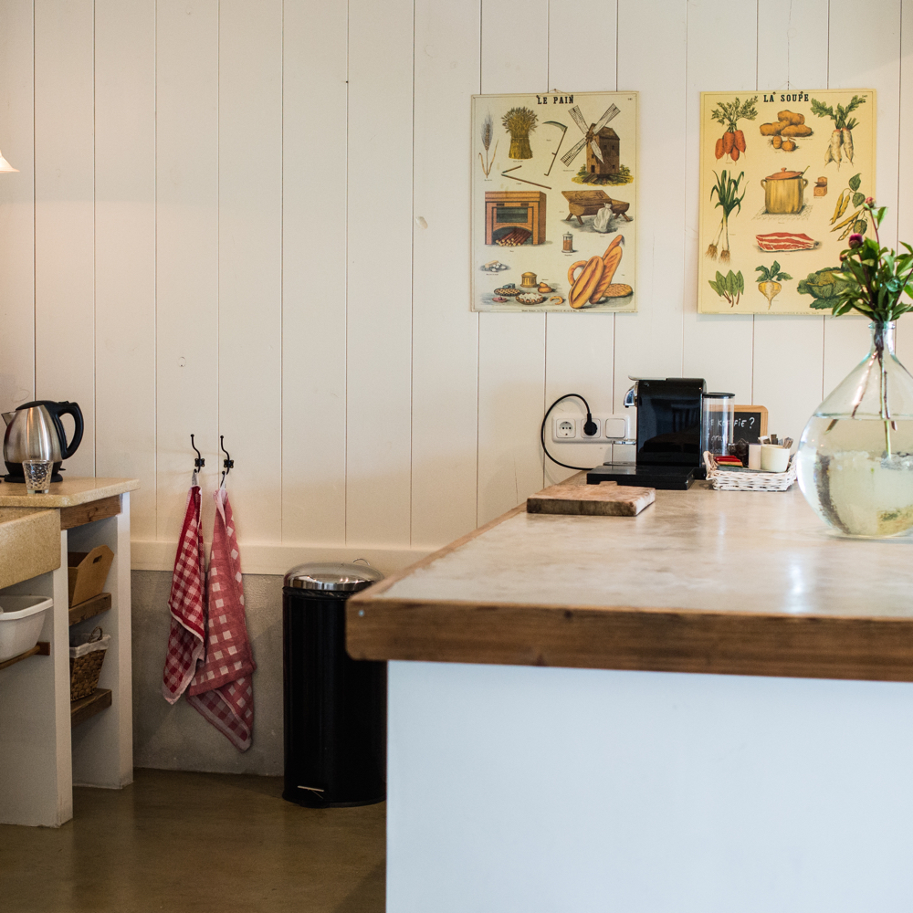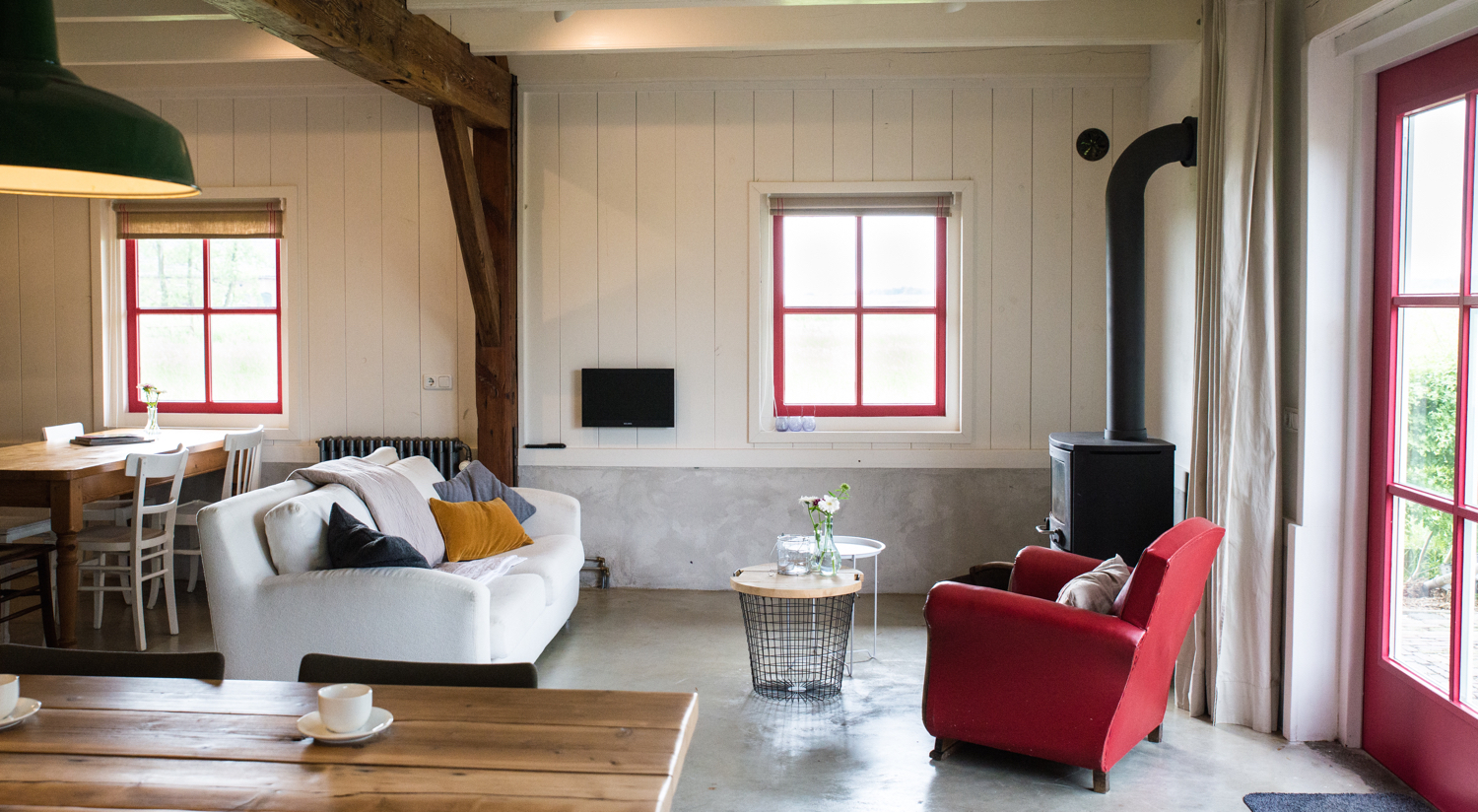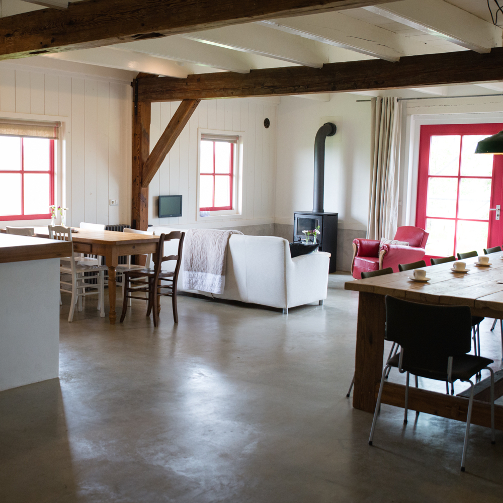 Jenny en Bram hebben de afgelopen jaren keihard gewerkt aan de realisatie van Bed and Breakfast Poldergoed. Er is een grote gemeenschappelijke ruimte met een lange tafel, mooie betonnen vloer, stoere houten elementen en industriele lampen. Let vooral even op de fonteintjes in de toiletten, die komen nog uit de oude kleuterschool van Bram. De sfeervolle landelijke stijl is warm, uitnodigend en geeft je een gevoel van thuis-zijn. Geniet hier in de gezellige zithoek bij de houtkachel of in de zomer op het terras voor de openslaande tuindeuren.