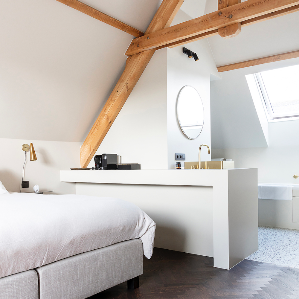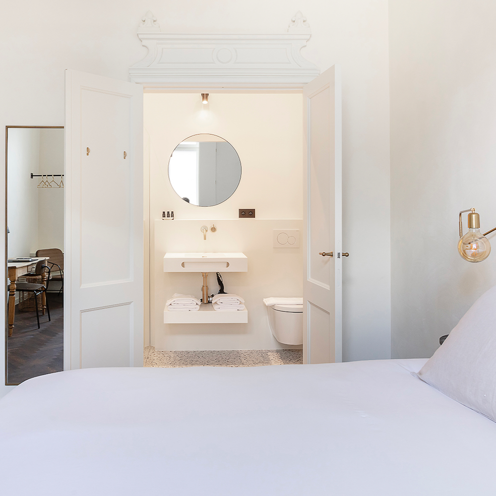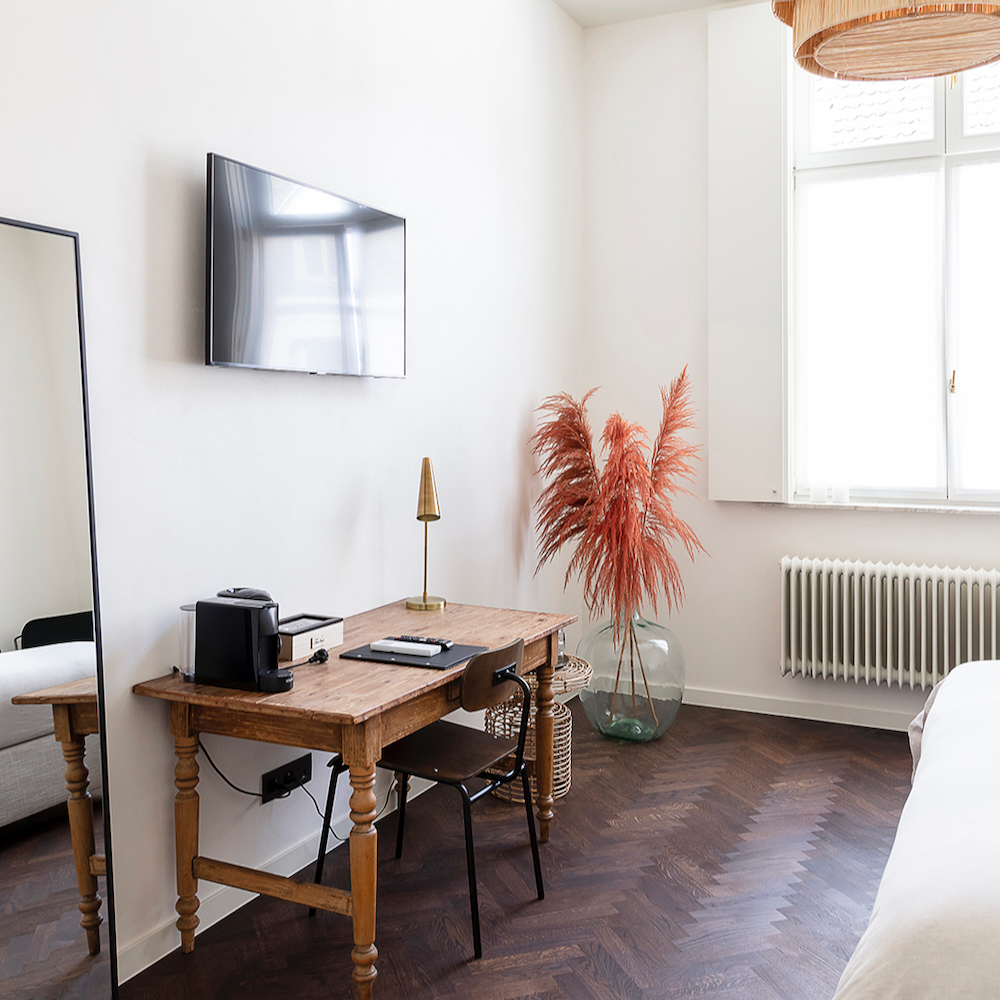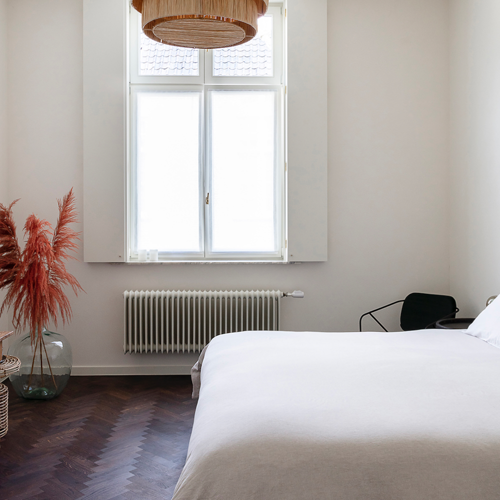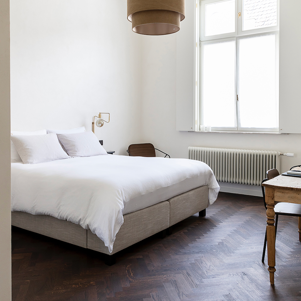 De ruime tweepersoons gastenkamers ademen allemaal dezelfde rustige sfeer door de mooie natureltinten. Voorzien van alle comfort, met een badkamer met regendouche en/of bad, badkamerproducten van Rituals, airconditioning en een kingsize boxspringbed met linnengoed van 100 % Belgisch Verilin linnen, Nespresso koffie en thee op je kamer. Kamer Belfort heeft als extra een privé terras met uitzicht op Brugge. In huis is er plek voor acht personen. In de tuin van B’Guest staat een wellnesshuisje waar aanvullend ook twee personen kunnen slapen. Dit huisje is apart te reserveren voor een romantisch nachtje weg met wellness en als extra te boeken als je met een groep van tien personen komt.