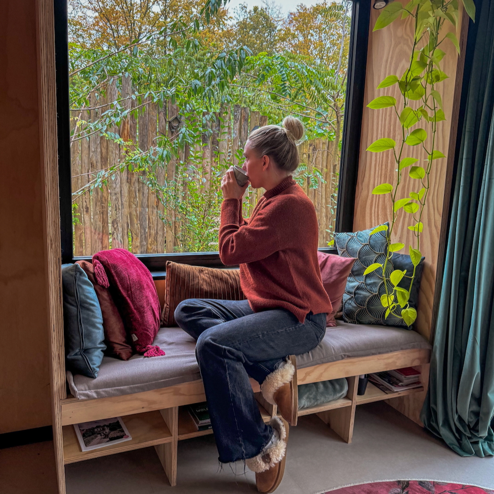 De huisjes zijn compact maar slim ontworpen, met veel hout, grote ramen en uitzicht. Binnen voelt het licht en warm, buiten begint direct het bos. Je merkt aan alles dat hier is nagedacht over hoe een plek je kan laten ontspannen: weinig afleiding, veel natuur en een inrichting die uitnodigt om gewoon te zitten, te lezen of naar buiten te kijken. Hier wil je pauze houden.