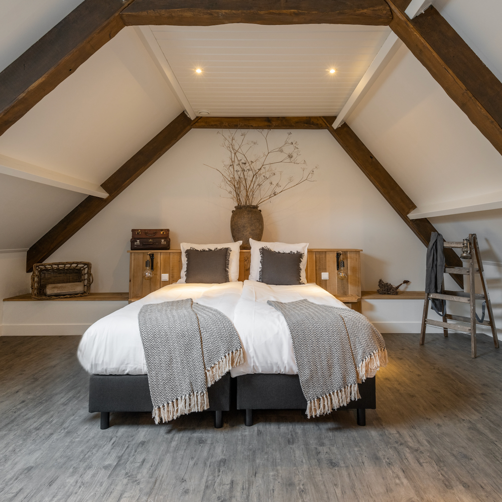 Overnachten bij Erve Broam met een groep doe je in een van de twee vakantiehuizen: Bie Gait of Bie Sien. Kies je voor Bie Gait dan wacht je een heerlijk verblijf in een meer dan ruime vakantiewoning voor 16 personen en vier kleine kinderen. Met mooie slaapkamers, elke kamer uniek. Ingericht in landelijke stijl met houten details, stoere balken en leuke details als ronde raampjes, Schotse hooglanders aan de muur en gezellige kippen als accessoires. Op de veranda geniet je van de sauna, whirlpool en heerlijke relaxplek.