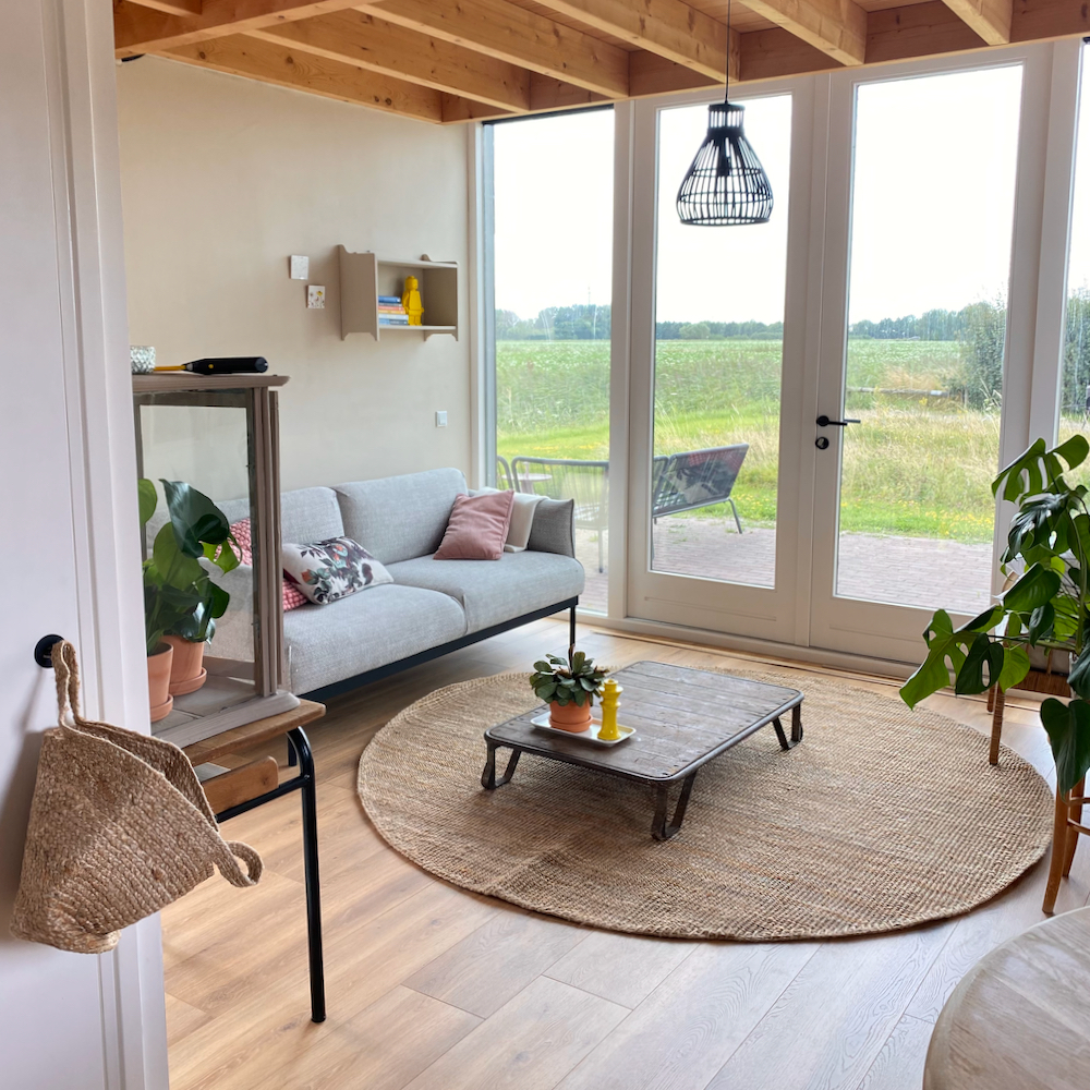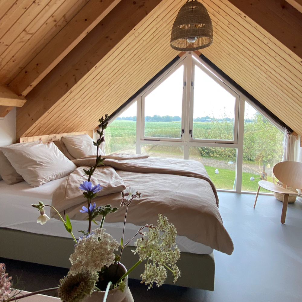 De grote glazen gevel is opvallend. Vanuit de living met zithoek, eethoek en een open keuken (met inductie kookplaat, een vaatwasser, oven, Nespresso koffieapparaat en koelkast) kijk je uit over de weilanden, het Gat van Bach (meertje naast het gemaal) en de akkers. De badkamer met toilet en inloopdouche bevindt zich op de begane grond. Ook vanuit het heerlijke bed, opgemaakt met 100% puur bedlinnen van By Mölle, op de open verdieping heb je een fantastisch uitzicht, bij helder weer op de sterrenhemel. Hemels overnachten krijgt hier een nieuwe dimensie.