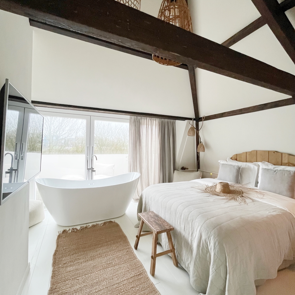 De twee suites, met de prachtige namen Es Vedra (het beroemde rotseiland bij Ibiza) en Vadella (een baai op Ibiza) hebben ook een eigen keuken. Als luxe extra hebben beide suites een vrijstaand bad én een sauna! Suite Es Vedra heeft ook een dakterras. De sfeer in alle suites is hetzelfde: mediterraans, een beetje Ibiza met Boho-chic. De naam sfeerhuis aan zee is hier dan ook helemaal terecht. Inspiratie gegarandeerd!