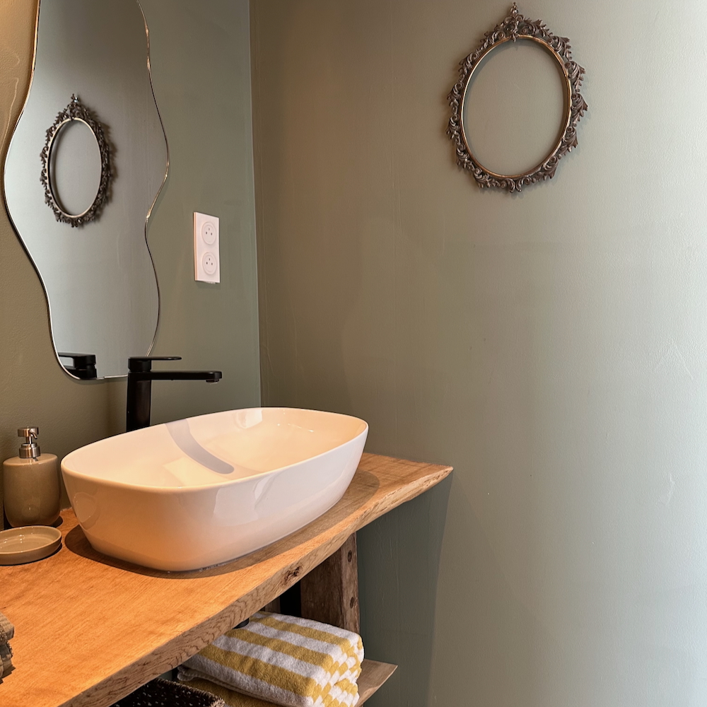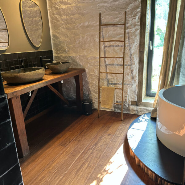 Ook de badkamer met dubbele wastafel, douche en badkuip ligt op de benedenverdieping, net als een van de slaapkamers. Boven aan de vide grenzen nog twee tweepersoons slaapkamers. Opgemaakte bedden bij aankomst, handdoeken voor tijdens je verblijf, de table d’hôtes: Ed en Brigitte doen er alles aan om je zoveel mogelijk te ontzorgen.