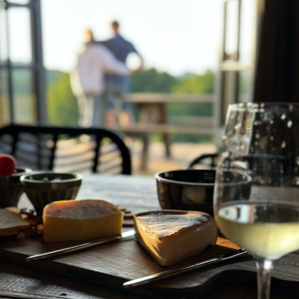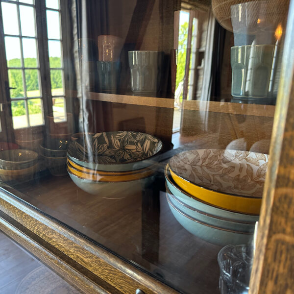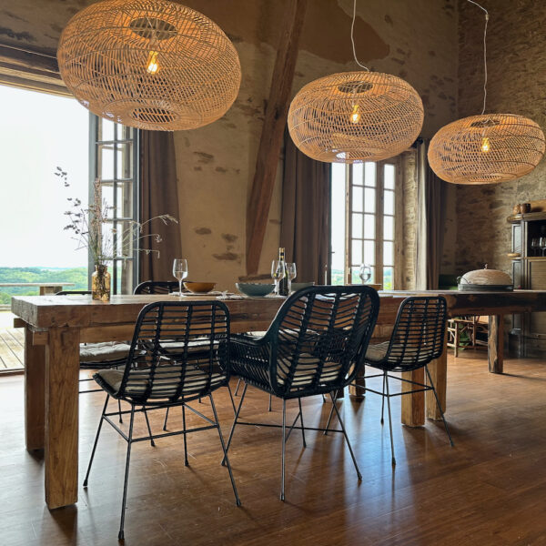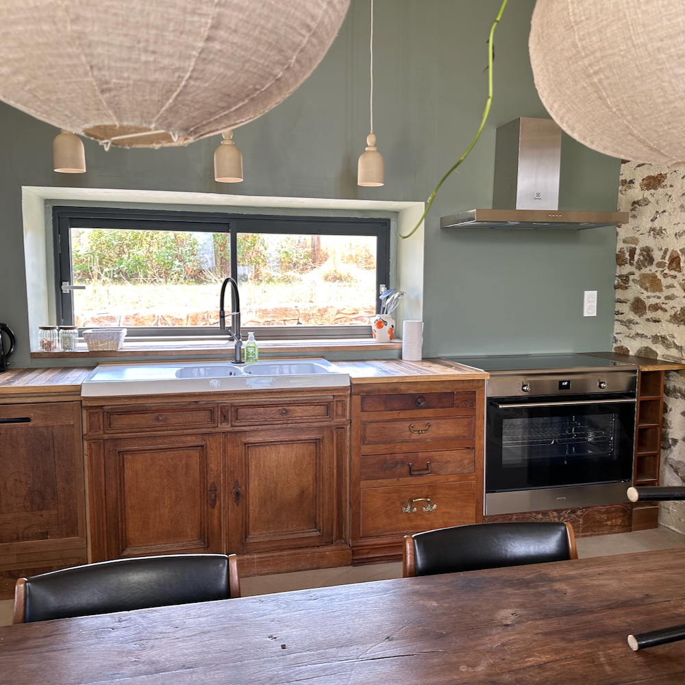 Wat direct bij binnenkomst opvalt, is de grote open ruimte. De sfeervolle loft heeft niet alleen meerdere openslaande deuren naar het terras die zorgen voor een ruimtelijk gevoel, ook de hoogte van het plafond draagt bij aan dat gevoel. Op de begane grond bevindt zich het zitgedeelte bij de haard, de lange eettafel en de open keuken met een fornuis, oven, espressomachine, waterkoker, koelkast en een vaatwasser. Geen zin om te koken tijdens je vakantie bij Le Veau Vert? Schuif aan bij de table d’hôtes, verzorgd door de Brabantse Brigitte.