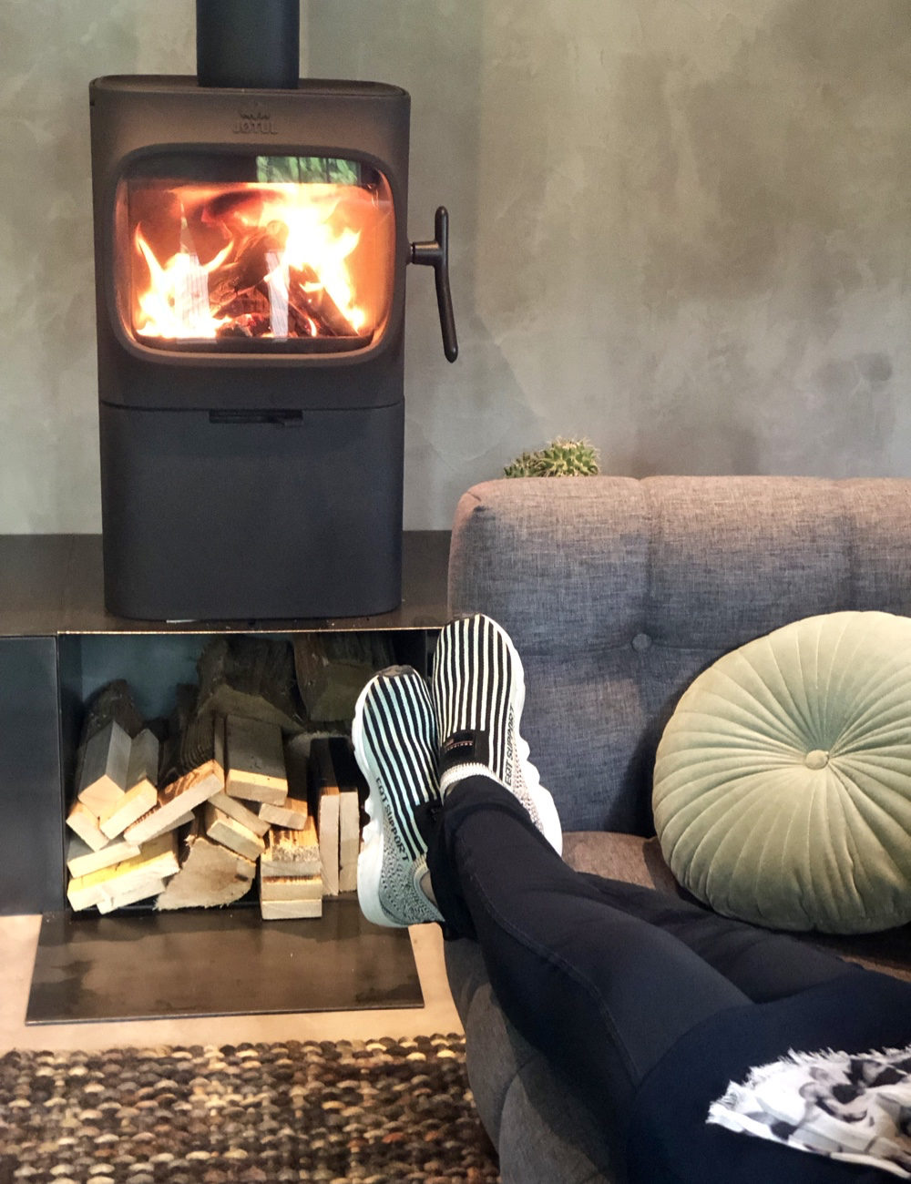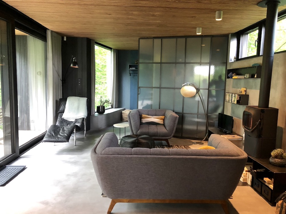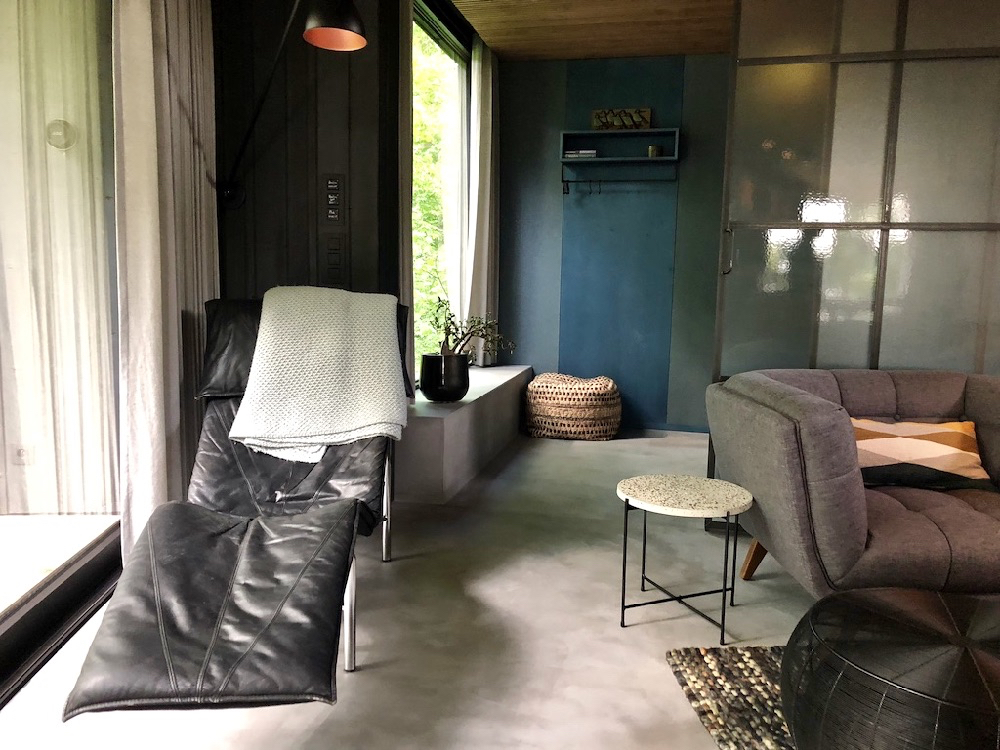 Houten weekendhuisje is trouwens een understatement. De cabin is een design huis, een luxe getaway door Ine en Maarten in samenwerking met een architect ontworpen en volledig zelf gerealiseerd! Elke centimeter van het huis is met zorg gebouwd en zorgvuldig afgewerkt door Maarten, die ervaring heeft als decorbouwer en tegenwoordig in de houtskeletbouw werkt. Ine, setdresser, zorgde voor de finishing touch. Kleuren en materialen zijn perfect op elkaar afgestemd. Wanden met inbouwkasten en vloeren lopen naadloos in elkaar over. Hout, beton (look) en glas zijn de hoofdbestanddelen van het huis, aangevuld met warme stoffen en design meubels, waaronder stoelen van Pastoe, een houtkachel van Jotul maar ook een vintage ligstoel van Ikea.