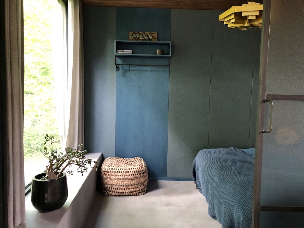 Loof is gemaakt voor twee personen. Het houten vakantiehuis heeft een slaapkamer, in prachtige kleuren blauw en met textiel op de muren. De grote ramen bieden je zicht naar het bos, een schilderij van bomen in elk seizoen anders.