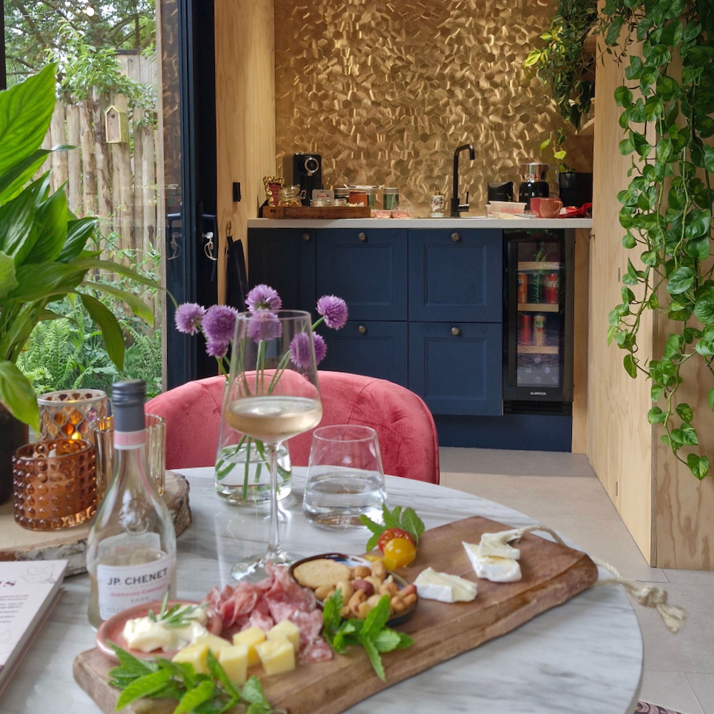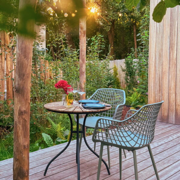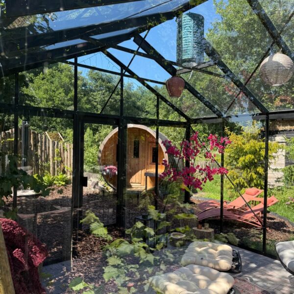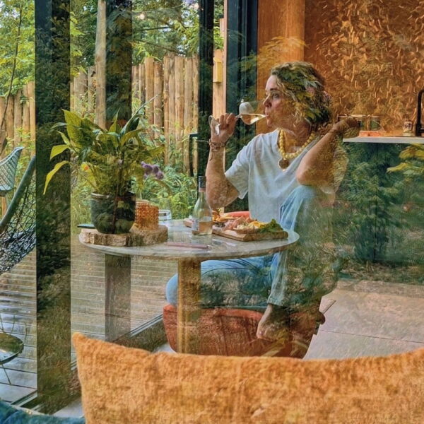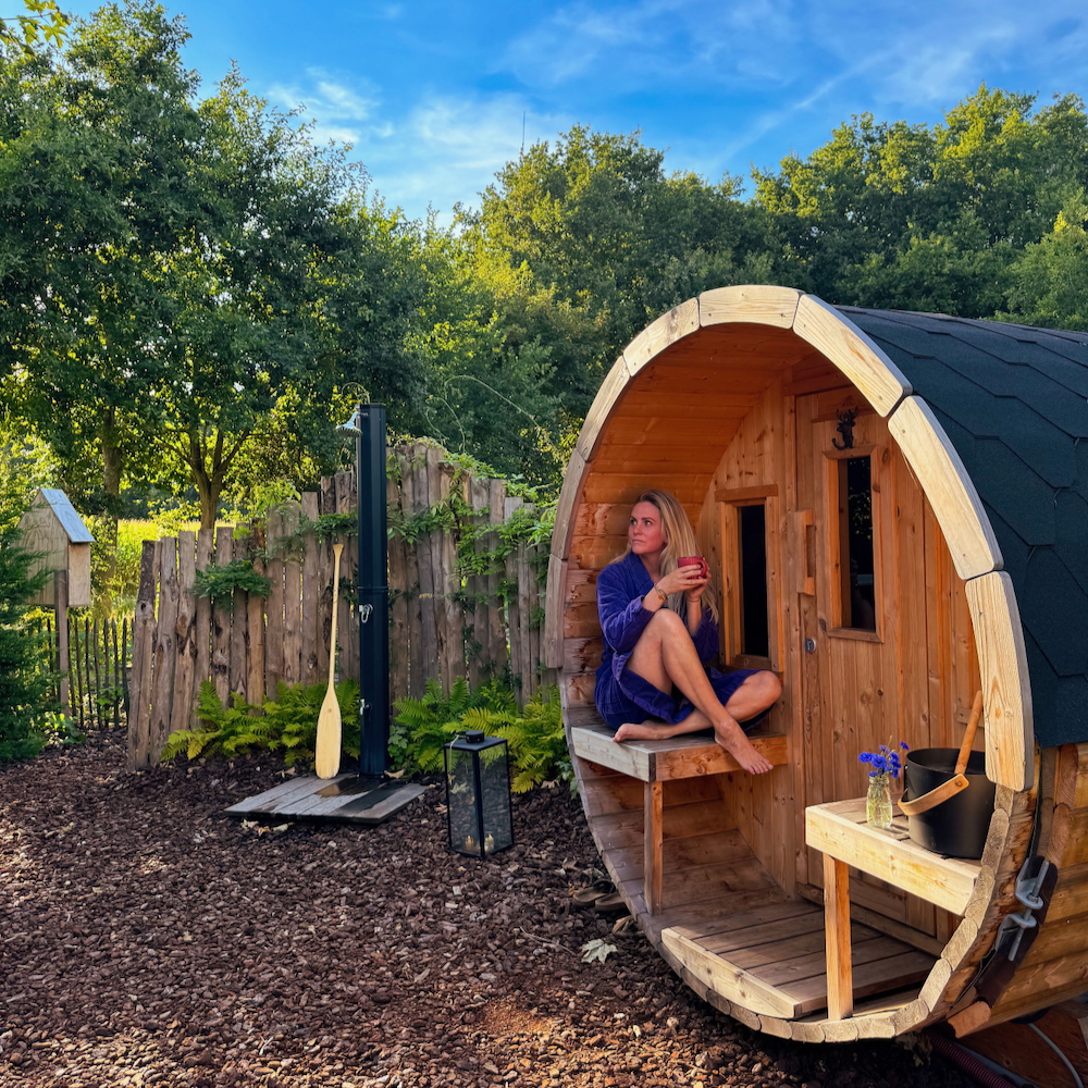 Huisje Night Blue heeft diepe blauwtinten in het interieur, geïnspireerd op de sterrenhemel boven je. Forest Green staat onder de grote els en is ingericht met zachte groentinten. Los van de kleuren hebben de huisjes veel overeenkomsten: een vorstelijk tweepersoons bed met heerlijke kussens, een loungeplek in een nis voor het raam waar je lekker kunt lezen, achter een schuifdeur je eigen badkamer met regendouche en een honestybar en koffiecorner met koelkast, koffie- en theefaciliteiten. Dankzij de beamer en het projectiescherm tover je het huisje ’s avonds om tot bioscoop. Buiten wacht een ruime vlonder met hangmat en luxe loungeset. Je ontbijtmand – gevuld met verse croissants, lokale yoghurt, granola en vers geperst sap – wordt ’s ochtends aan je deur bezorgd. Zeker reserveren hoor, zo heerlijk om je dag in alle rust en met deze verwennerij te starten. Denk daarbij de kippen en eenden die in de tuin scharrelen, een eekhoorn of bonte specht in de bomen en het ruisen van de wind door de bladeren. Hoor je die uil? Op zoek naar extra verwennerij? Reserveer de privé wellnesstuin met hottub, barrelsauna en kas. Wat een plek!