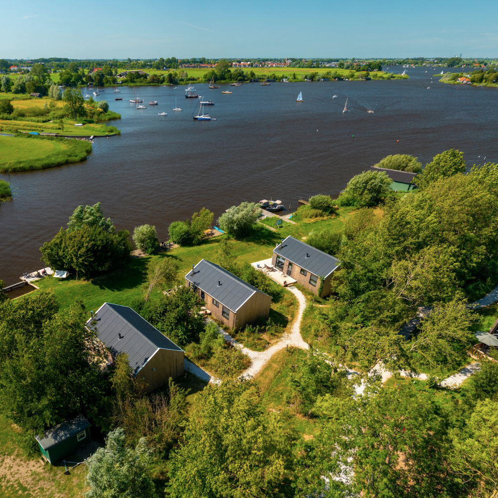 Qua uiterlijk zijn de huisjes anders, gebouwd volgens drie ontwerpen met als basis dat binnen en buiten in elkaar overlopen. Door de grote ramen en door de ligging. Of direct aan de waterkant of met zicht over de weilanden. Vijf van de huisjes liggen direct aan de waterkant en hebben een eigen aanlegsteiger. De overige zeven huisjes liggen middenin het eigen bos, waarvan vijf met uitzicht over de weilanden.