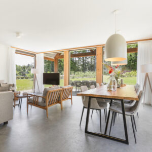 Er zijn villa’s voor 6, 8 en 10 personen. Standaard zijn de vakantiehuizen van Landal PUUR Exloo uitgerust met een sauna en twee badkamers waarvan een met een sunshower. De keuken van de villa heeft alle benodigde luxe apparaten, waaronder een vaatwasser, 5 pits inductie kookplaat, combi oven en een Nespresso apparaat. Drie slaapkamers minimaal en sommige villa’s hebben een leuke bedstee. Een ruime woonkamer, grote schuifdeuren naar de tuin of het terras; wat wil je nog meer?