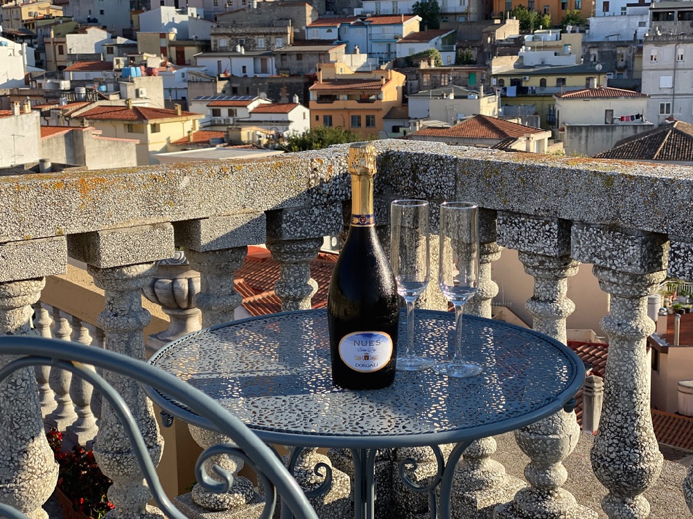 Honderd jaar geleden laat de vader van lady Maria Luisa, een in Cagliari gelegerde generaal, een ‘buitenverblijf’ in Dorgali bouwen. Inmiddels laat de lady, zelf ook op leeftijd, hier gasten genieten van het rijk gedecoreerde Palazzo Santa Caterina. Marmeren vloeren, portalen tot het plafond en damasten kleden over tafels vol spelletjes en sigaren sieren het statige stadspaleis. Een smalle trap leidt naar het dak waar een aangename verrassing op de gasten wacht. Op het dakterras, onder zachte wollen dekens nippend van een gekoeld glaasje mousserende witte Nues of een robuuste Cannonau, kleurt hier de ondergaande zon Dorgali langzaam roze.