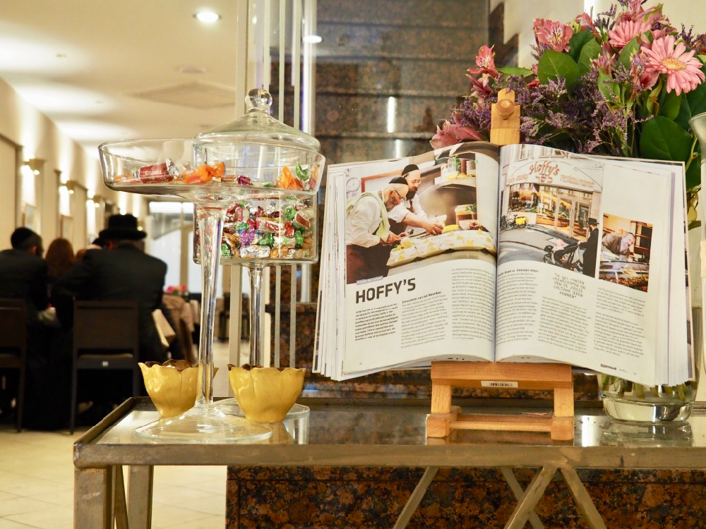 Langs al het goud en de diamanten in de etalages van de Joodse diamantwijk spoed ik mij vervolgens naar het Joodse restaurant Hoffy’s waar mijnheer Hoffman mij verwelkomt. Een proeverij van koosjere gerechten wordt voor mij neergezet. Ik leer dat de vis in de Joodse keuken vinnen en schubben moet hebben, dat het vlees afkomstig moet zijn van ‘spleethoevigen’ en ‘herkauwers’ en dat wild, fazant of mosselen geen plaats op de kaart zullen krijgen. Het intrigeert me dat in de Joodse keuken melk en vlees strikt gescheiden moeten blijven. Voor een goede spijsvertering mogen pas 6 uur na het eten van vlees weer zuivelproducten gegeten worden.