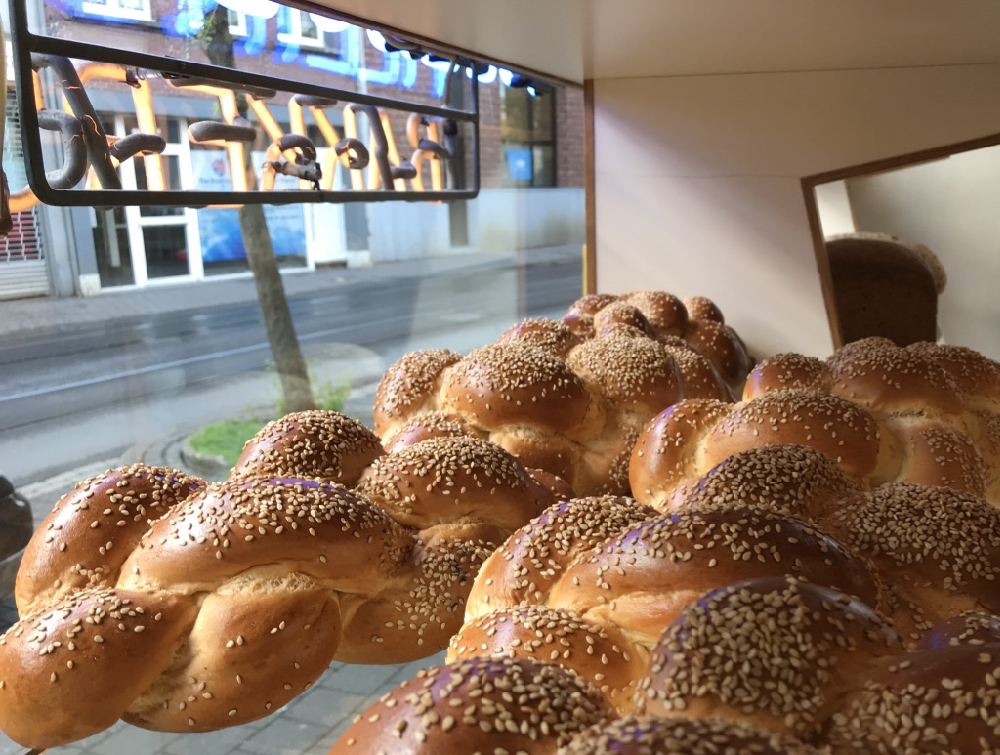 Iets verderop in de diamantwijk zit de bekende Joodse bakker Kleinblatt. Lactosevrij paneermeel, lactosevrije pasta en de heerlijkste taartjes zonder en met melk worden hier in grote getale in de achtergelegen bakkerij bereid. In de etalage van Kleinblatt ligt op vrijdag het vlechtbrood, de challe, onderdeel van het ‘vieren’ van de sabbat.