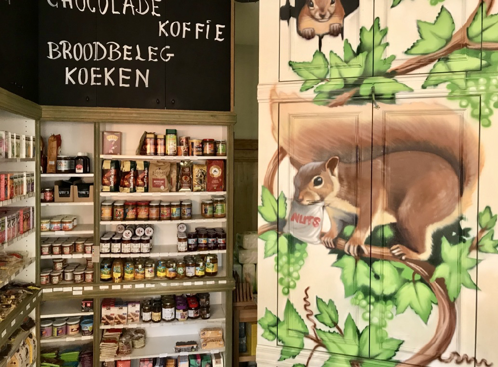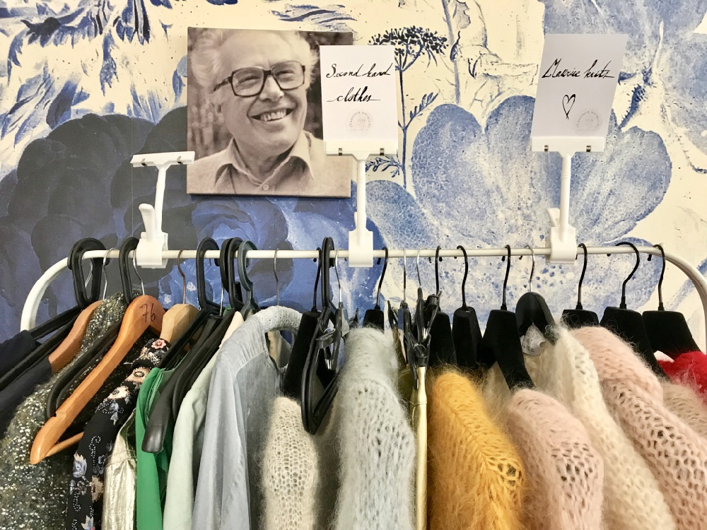 De volgende dag schijnt de zon. Blij fiets ik langs de beschilderde gevel van het Biohoekske. Ik moet absoluut even binnen kijken. Een aantal wanden zijn al even vrolijk voorzien van een eekhoorn en andere gezellige taferelen. Ik fiets verder om mij onderweg te laten verrassen door knusse adresjes met als hoogtepunt en tevens eindpunt van de oorspronkelijke wandeling, het nagenoeg laatste pand van de Cogels Osylei; ‘Maurice Coffeebar’. Iedere donderdag komen de bejaarde vriendinnen van ‘bompa’ Maurice, opa van oprichtster Véronique, hier breien. De collectie van de omaatjes hangt achter in de winkel en is te koop. Binnen voel ik mij onmiddellijk thuis tussen het blauwwitte behang en de retro chique inrichting. Ik word getrakteerd op rozenblaadjes granola, bijkomend voordeel: volgens opa Maurice is het goed tegen dementie. Bij het glas een kaartje van opa. Eet smakelijk! Hoe attent.