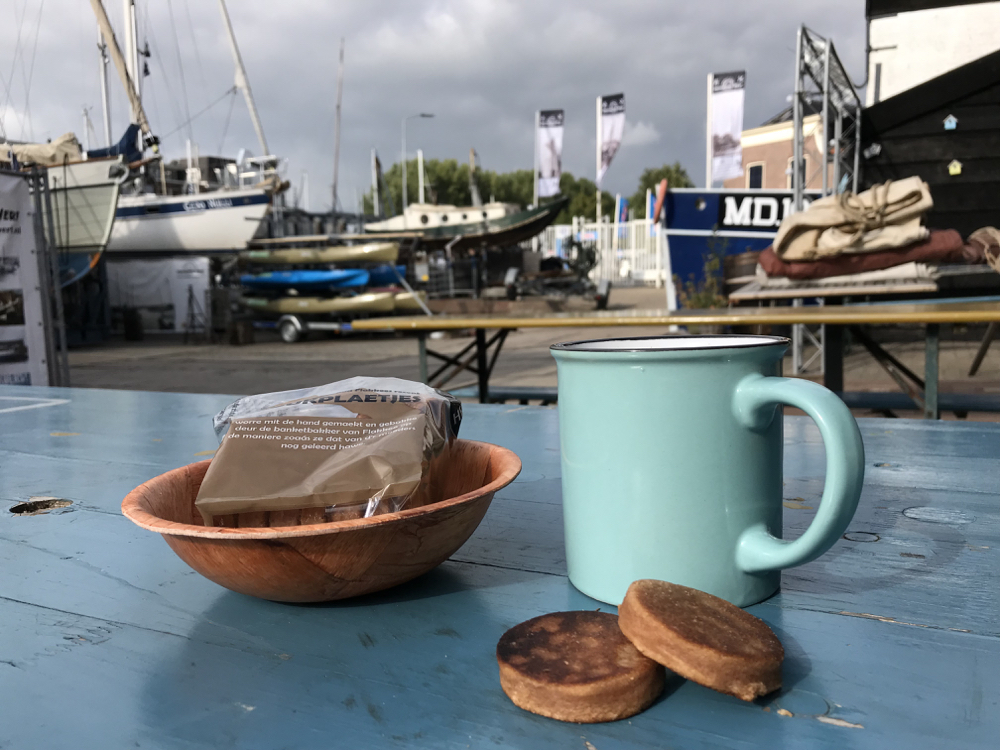 Aangekomen op de volledig gerestaureerde Menheerse Werf maakt mijn hart een sprongetje. In het oude pekelpakhuis sieren verweerd hout, roestig ijzer, antieke meubelen en oude houten kasten één van de smaakvolst ingerichte ruimtes die ik ken. Kinderbedden op een vide zijn bereikbaar via een houten ladder. Een badkamer met een oude deur waar ik keer op keer mijn hoofd zachtjes stoot omdat ik vergeet te bukken voor de lage balken. Een door de emaille bekers ouderwets ogend keukentje. Een bank waar ik luxe languit op kan liggen en… een pakje ‘Kruukplaetjes’. De lekkerste dikmakers die ik ooit geproefd heb. Zonder op de verpakking te letten neem ik er drie. Drie bomvol met boter en suiker zo leer ik later. Om niet te bederven op de soms maandenlange tochten op zee.