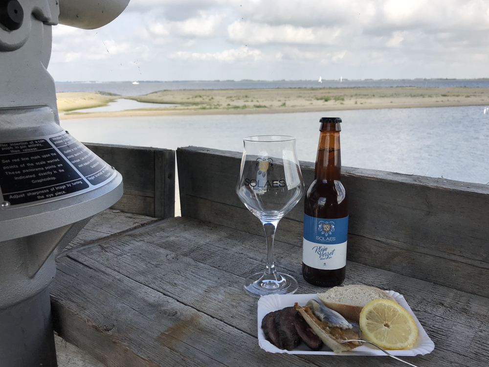 Niet ver buiten de haven van de Menheerse Werf ligt natuureiland Bliek, één van de mogelijke dagtochten die je vanaf de B&B met bijbehorende boot kunt maken. Bliek blijkt perfect voor het nuttigen van een zelf meegebracht borrelhapje. In de houten uitkijkhut snacken wij wat warm- en koud gerookte haring en dito ganzenborst. In combinatie met een koel lokaal biertje wordt vogels spotten wel heel verleidelijk.