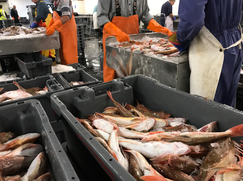 Op een nagenoeg nuchtere maag krijg ik de volgende morgen een rondleiding over de visafslag. Omringd door enorme scharren, schollen, herkenbaar aan hun rode stipjes, kabeljauw, rode poon en een enkele giftige Pieterman, val ik van de ene verbazing in de andere. Honderden kilo’s vis worden per opbod afgeslagen. Bakken vol afgeslagen vis wachten onder het ijs op hun eigenaar. Eén van de orders staat klaar voor een Rotterdamse marktkoopman. Bij zijn vijftien meter lange kraam vliegt de vis door de handen van wel twintig dames de volgende morgen zijn kraam uit. We sluiten af met een demonstratie garnalen pellen. Annie en Mina, die beiden eerder konden pellen dan lopen, halen stug door pellend wel een kilo per uur.