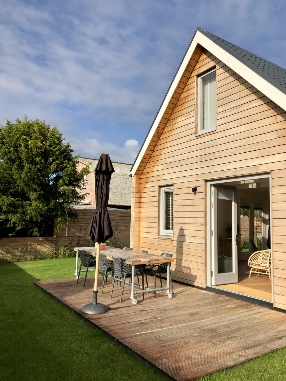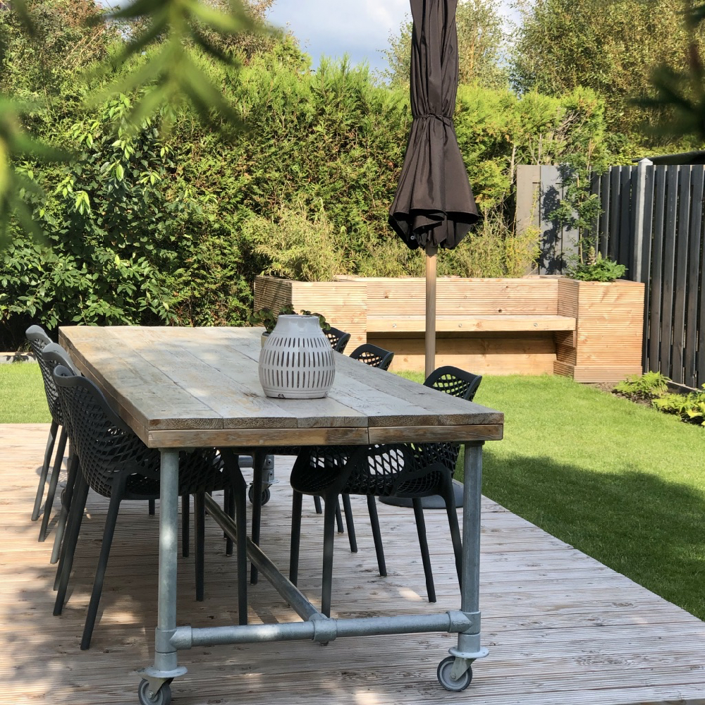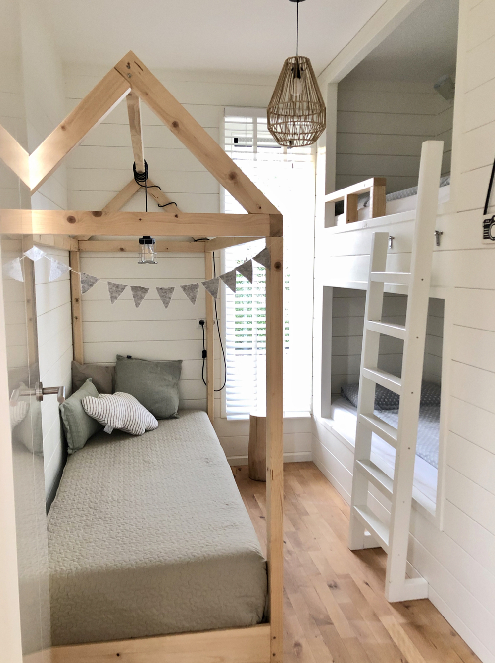 Wanneer je de slaapkamer op de begane grond inloopt, weet je direct dat dit de favoriete plek van kinderen is. Niet alleen het stapelbed is leuk, ook het zelf gebouwde ‘bedhuisje’ is een topper! Ook voor jou zijn er favorieten in huis. De diagonale tegels in de badkamer, het hoge plafond, de afscheiding van de slaapvide, de eethoek met op maat gemaakte bank, de meubels in de tuin… volop wooninspiratie.