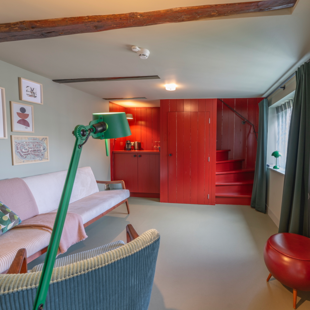 - De Opslag ligt op de begane grond en heeft een warme, eigentijdse inrichting en direct toegang tot de gemeenschappelijke ruimte waar het ontbijt geserveerd wordt.