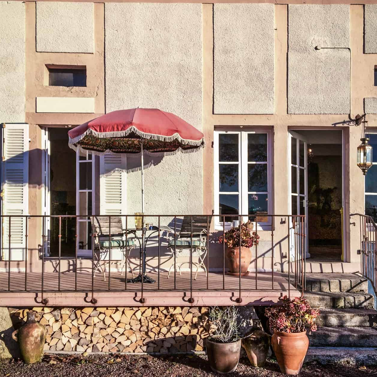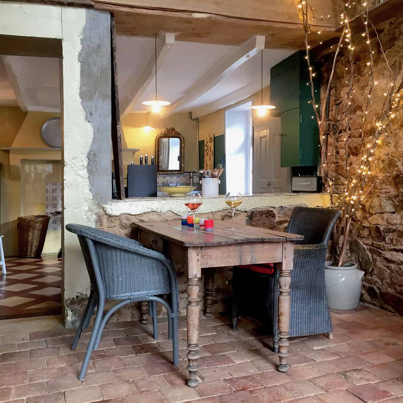 2-persoons vakantiehuis Versailles (met eventueel een baby) is ondergebracht in de oude schuur op het erf. Met de houten balken in het zicht, de granieten muren en de ruwe betonnen afwerking, heeft het huis een heel eigentijdse, industriële uitstraling. Je drinkt je wijntje op je eigen terras met uitzicht op de bloemen- en moestuin waar het antieke waterbassin het middelpunt vormt en de kippen rondscharrelen. Nou vooruit, nóg een wijntje dan…