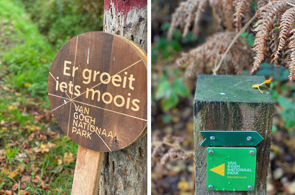 De routes zijn eenvoudig te volgen en te herkennen aan de bordjes met daarop ‘Van Gogh Nationaal Park’. Je vindt ze op de paaltjes waarop ook de wandelknooppunten staan aangegeven.
