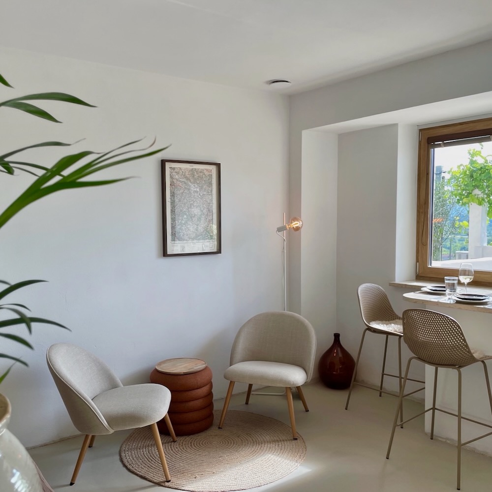 Vipava View bestaat uit twee studio’s: Garden Studio Apartment en Balcony Studio Apartment. De Garden Studio ligt op de begane grond en heeft directe toegang tot de tuin en een privéterras. Balcony Studio ligt op de bovenverdieping en biedt uitzicht over de heuvels en de wijngaarden, zelfs vanuit je bed! De twee studio’s zijn door Wouter en Daphne met smaak ingericht, elk voor twee personen. Je stapt binnen in een lichte, minimalistisch ingerichte studio met zachte, natuurlijke tinten en veel oog voor rust. Het interieur voelt warm en tegelijk modern: lichte muren, accenten van hout en zorgvuldig gekozen meubels maken de ruimte uitnodigend. Het grote raam zorgt ervoor dat het uitzicht over de vallei vanzelf een hoofdrol speelt. De badkamer heeft een lekkere regendouche, in de keuken kun je een simpele maaltijd bereiden. Een eenvoudig ontbijt (eieren, yoghurt, fruit, crackers en beleg) wordt voor je klaargezet. Neem plaats aan de kleine houten tafel, in de tuin of op je balkon terwijl de zon langzaam over de wijnranken trekt. Met het geluid van vogels op de achtergrond begin je ontspannen aan je dag. In de gedeelde tuin wachten verschillende zitjes tussen de fruitbomen. Tijd om plannen te maken: Wouter en Daphne geven je graag tips voor lokale bezienswaardigheden, wijnhuizen en restaurants in de omgeving.