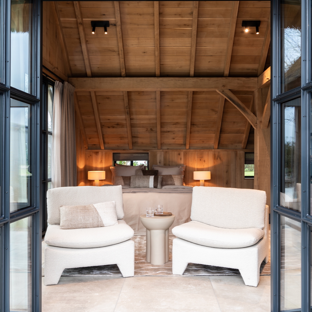 Bij De Luxe Finnen verblijf je in een vrijstaande rietgedekte wellness cottage. Alles in het huis getuigt van een zorgvuldige keuze aan luxe materialen. De combinatie van hout, zachte kleuren en veel licht bepaalt de warme sfeer. Elk detail is doordacht en comfortabel, zonder overdaad. De leefruimte is ruim en prettig, in de kitchenette zet je koffie en thee of maak je een eenvoudige maaltijd. Het tweepersoons bed is voorzien van fijn bedlinnen. Ook buiten gaat het comfort door. Op het terras staan loungemeubels en er is een Big Green Egg-barbecue voor lange avonden buiten. Extra prettig is de privé parkeerplaats met gratis laadpunt voor een elektrische auto. Een klein detail, maar wel één die past bij de hoge standaard van De Luxe Finnen.