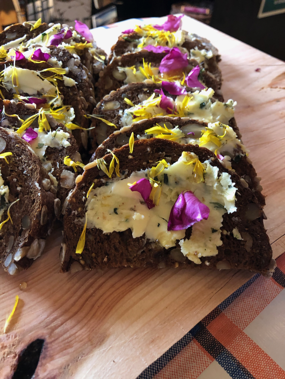 Na een wandeling van ongeveer twee uur komen we terug bij de Natuurschuur, waar chefkok Flang de lunch heeft voorbereid. Eerder die week had hij al eekhoorntjesbrood gedroogd, dit gebruikt hij nu als bouillon voor de soep. Het verse eekhoorntjesbrood dat we hebben geplukt gaat even op de bakplaat en daarna door de soep. Bij de soep eten we notenbrood met bloemenboter, honing en eetbare bloemen. Verrassend lekker! Vervolgens proeven we een pasta met wildplukpesto, waar allerlei natuurlijke ingrediënten in verwerkt zijn. Als dessert maakt Flang typisch Terschellinger plotsies (een soort poffertjes) met verse bramen en cranberry’s.