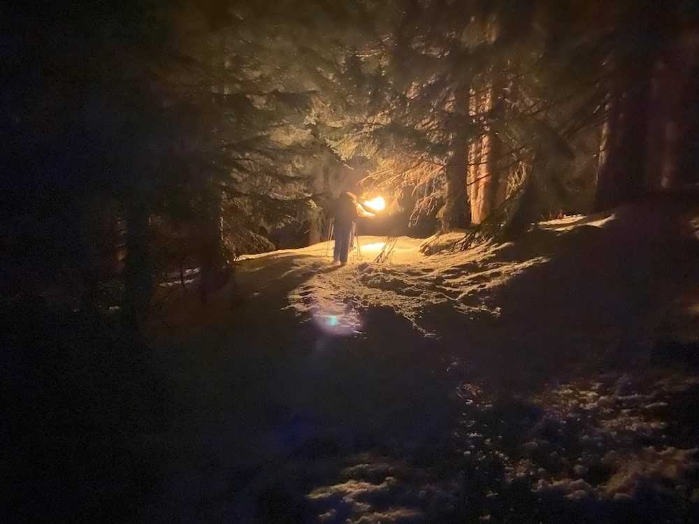 Op speciale sneeuwschoenen, om niet onder de diepe sneeuw te verdwijnen, wandel je naar boven. Onder je kraakt de sneeuw, om je heen niets dan stilte. Onderweg wijst Hervé naar sterrenbeelden die duidelijk zichtbaar zijn tegen de donkere hemel. Eenmaal omgeven door het sprookjesbos opent Hervé zijn kannen vol warme wijn en trommels met zoute hapjes en de idylle is compleet. Een nachtelijke tocht die je je voor altijd herinnert.